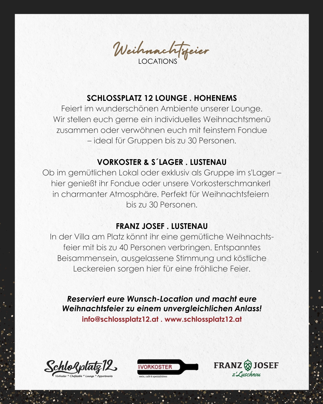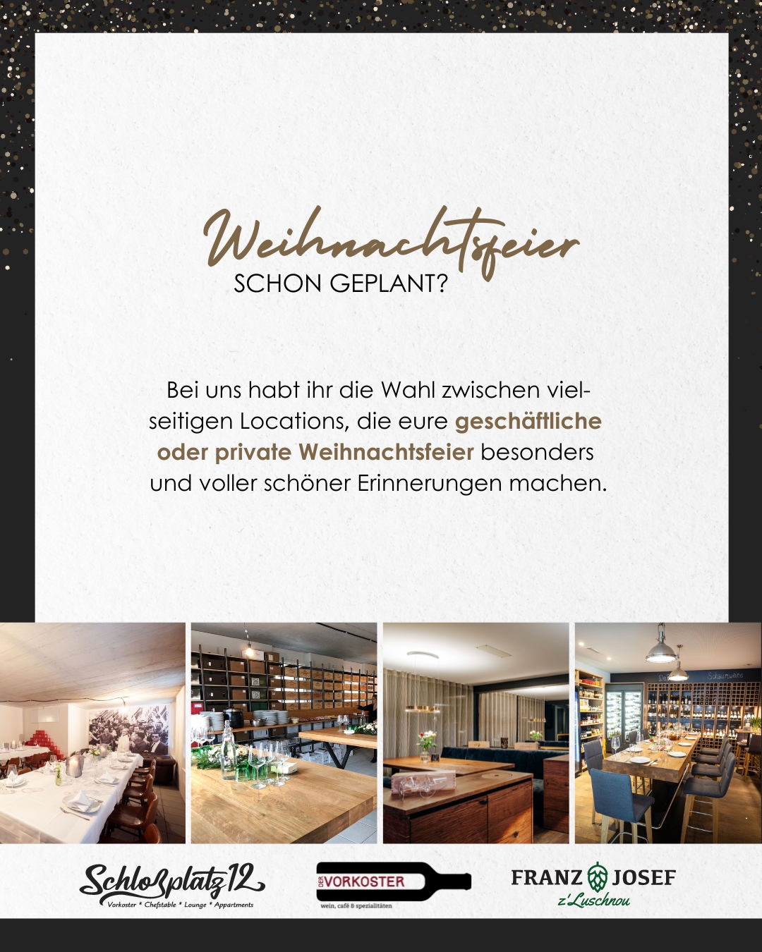 Tauchen Sie ein in unsere Welt der vielfältigen Küche. Sie möchten einen Drink in unserer gemütlichen Lounge genießen oder den Abend mit Freunden und/oder Familie bei leckeren Tapas ausklingen lassen? Dann sind Sie bei uns am Schlossplatz genau richtig. Denn ob Drinks und Snacks in unserer Lounge oder feine Platten und Weine im Vorkoster, wir verwöhnen Sie gerne.